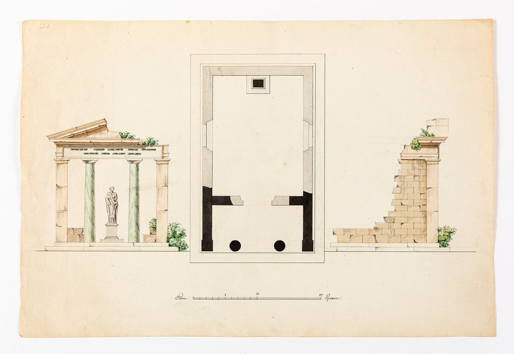 The 19th century plan of the Ruined Temple is unique from similar drawings of that era in that it exhibits the effects of time in its poché. Like contemporary construction drawings, the full-height walls are rendered as black, whereas the ruined walls, below the standard 4-foot cut line, recede into thin lines and a tan wash. We can immediately read the plan as three-dimensional, understanding which walls and columns have survived the ravages of centuries, and which have crumbled. Interestingly, though, the artist still renders the fenestration in both lateral walls as trapezoidal cuts, as though the windows were floating above the rubble and crumbled stones.